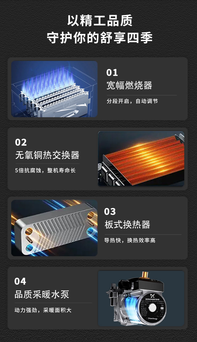 全銅質(zhì)板換器采用蜂窩式分層設(shè)計,熱水交叉對流,加熱更快更恒溫,體驗更舒適,采用意大利西特比例閥,智能調(diào)節(jié),丹麥格蘭富水泵